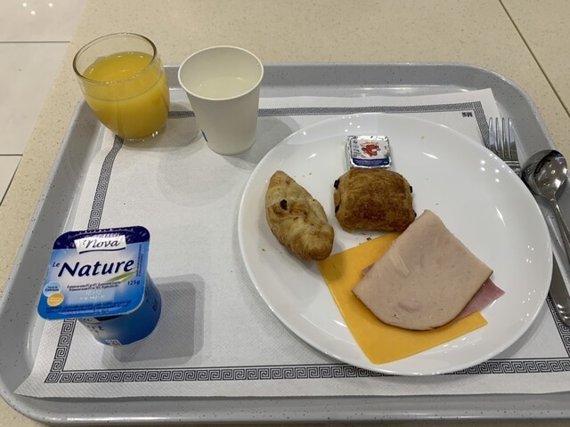 外は真っ暗、朝7時から無料朝食。しかし7時5分にならないと準備が整いません。飲み物、パン、ハムは有人渡し、おそらく大量に取り、持ち帰る人がいるからと思われます。質素な最低限の食事です。フランスの大都市駅近で、1泊63ユーロは格安、ホテルは7階建て216室ですが、リーグアンの試合日などは満室なんでしょうね。