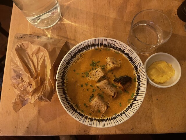 お昼時、観光途中の昼食です。ブイヤベースを頼みましたら、ボウルの中にスープとパン。外にアイヨリが付いてきます。現地の人が食べるブイヤベースはこんなものなのかと思わせてくれる味わいですね。日本の魚のお味...