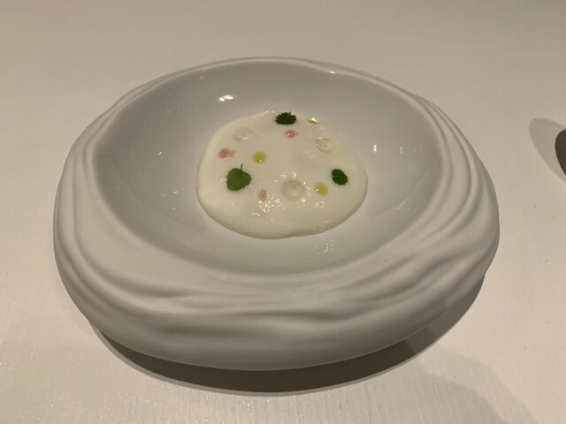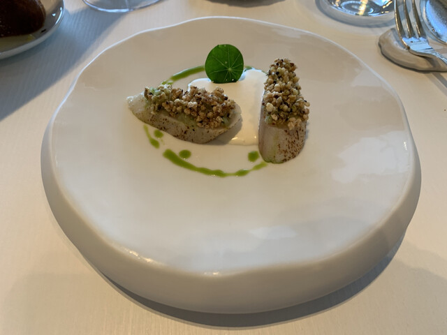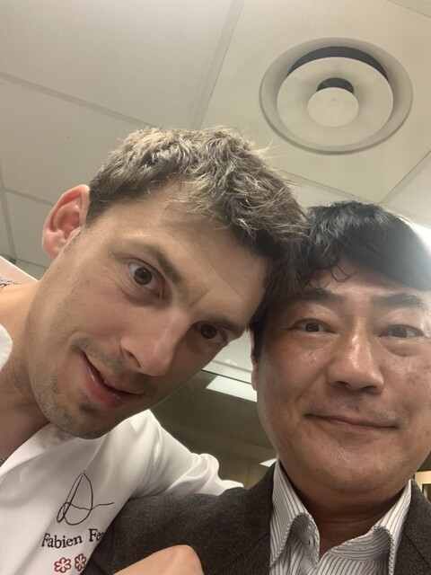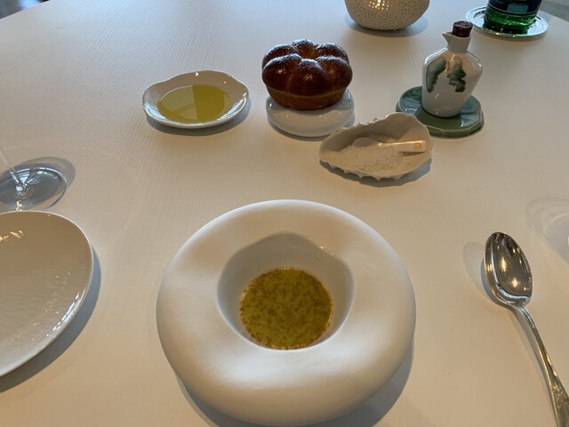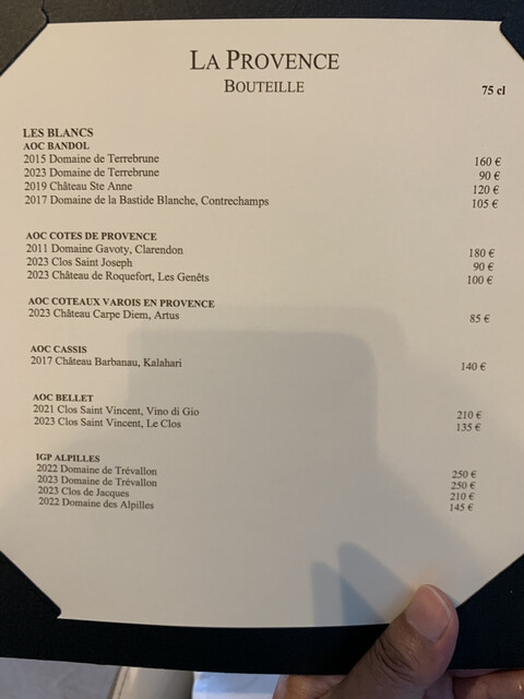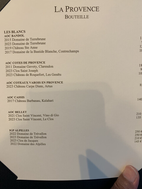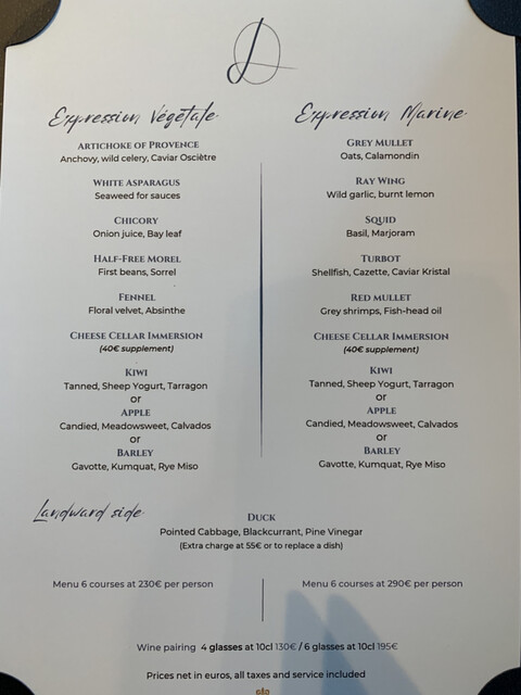 弱冠35歳でミシュラン3つ星取ったシェフFabien Ferré在籍レストラン。5つ星高級ホテル内立地です。こちらのホテルはお高いので、泊まりはポールリカールサーキット付属ホテル、20分ほど歩いて予約時間19時半到着です。メニューはベジタブル・魚もしくは両方の組み合わせ。オプションで鴨・チーズセレクション。チョイスは魚に鴨、普通別途チーズは頼まないのですが、ミシュラン調査員が、チーズセラーだけでも来る価値あると書いてましたから。女性サービス陣は名乗って制服、ヘアスタイル統一でチャーミング。お料理基本マヨ味、いい香り、どことなくアジアンテイストがあるのが、調査員の琴線に触れたんでしょうか?昼夜週4日営業なのでお値段高め、シェフは大柄でフレンドリーでした♪