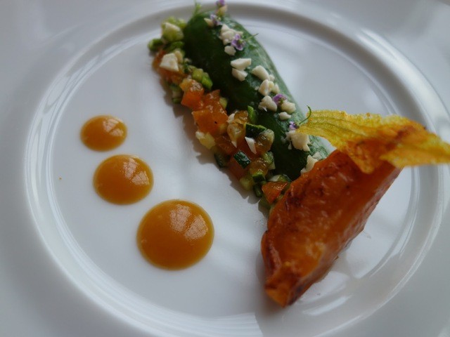 ズッキーニとアプリコット。これはびっくりするほどまずかった。絵のような皿で見た目は悪くないのに味が全然だめ。頭の中で「ヤバいレストラン警報」が鳴り響く。当該サイレンが作動したのはコペンハーゲンの『Grønbech&Churchill』以来です。