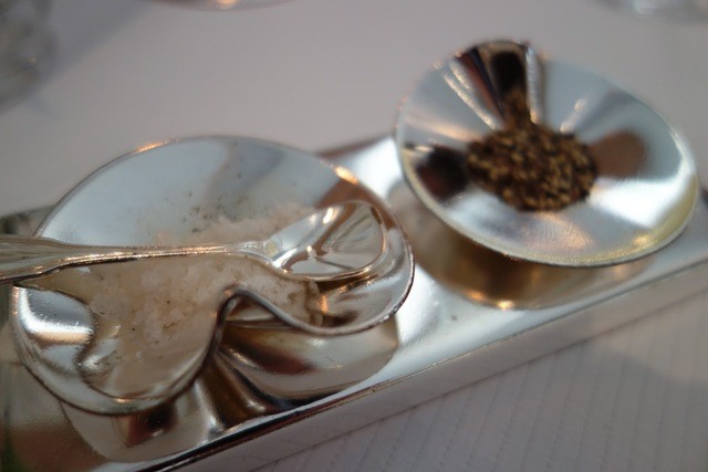 さっそくアミューズが供されるのですが、この量すごくない?チーズ味とトマト味。ひとつづつつまむのか、全部食べて良いのかわかりかねる。恐る恐るもうひとつ食べても怒られないので、あとひとつ、あとひとつ、とビビりながら食べていると、前菜が到着しアミューズは下げられました。なるほど、間をつなぐために好きなだけどうぞ方式なわけですな。