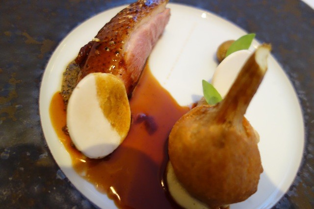 いやー美味しかったチーズだチーズだと思いきや、もう一度肉。ワオ、メインディッシュ2回転方式はメイと同じですな。カナールにアーティチョークの肉詰めコロッケ的なもの。鴨は仔牛と軌道が同じで残念ながら飽きちゃいました。