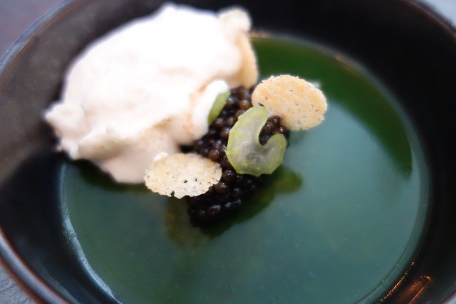 キャビアにセロリのムース。キャビアをメインキャストとしてしっかりと食べるのは久々。シャンパーニュと共に至福のひととき。セロリはそれほど好きな食材じゃないけれど、このムースの出来はパーフェクト。