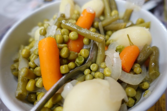 温野菜も用意されるのですが、これは火が通りすぎておりグズグズでイマイチです。前日にパリ8区の「LeCinq(ル・サンク)」で食べたグリーンピースとは似ても似つかぬ味。もちろんこれだけの人数を待たせずに受け入れるには仕方のないことでしょう。