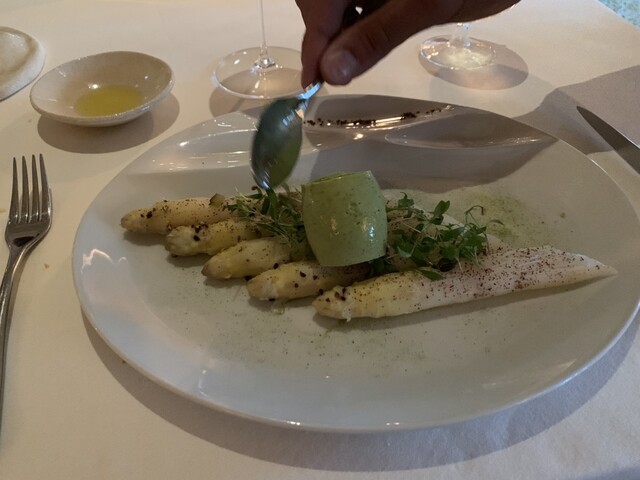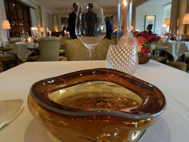 モナコの高級ホテル内2つ星レストラン。週休2日で夜のみ営業、日曜19時半開店直後のせいかまだお客さん入店少なめ。コートダジュールエリアのフランス国鉄終電は21時台とめちゃ早く、気が気ではないので、あらかじめメニューダウンロードしておき、アラカルト即オーダー、LES VINS BLANCS 2021 BANDOL Domaine Tempier 130 €