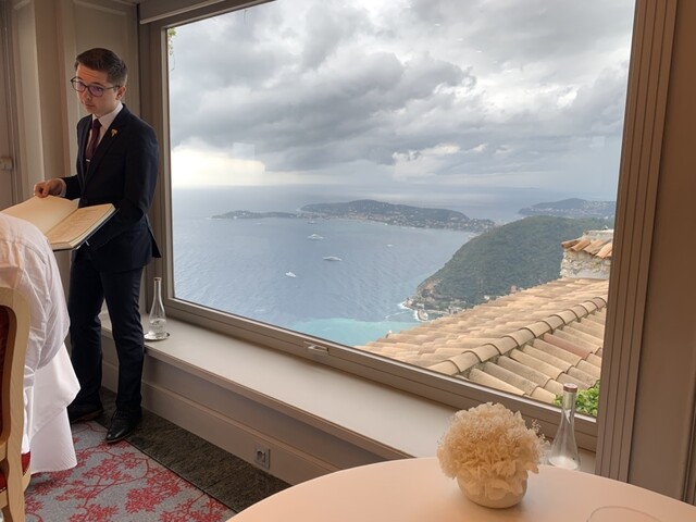 人気観光地エズのルレエシャトー・2つ星レストランでランチ。敷地内入っても石段アップダウンあり、雨の日の本日はスリッピー。平日限定4コースメニューにするつもりでしたが、好物のサバが入らなくなるようなので、6コースHorizon 220€。1泊20万円オーバーのホテル内レストランだけあって、アペリティフのグラスシャンパンもクリュグの白・ロゼ入ってます。二代目若手シェフ、2022にMOF取ってコラボも積極的、緑ソースはいずれもタイ料理のエッセンス入っている感。珍しく天気良くないので、絶景もいまいち。
