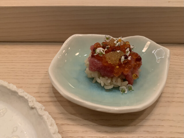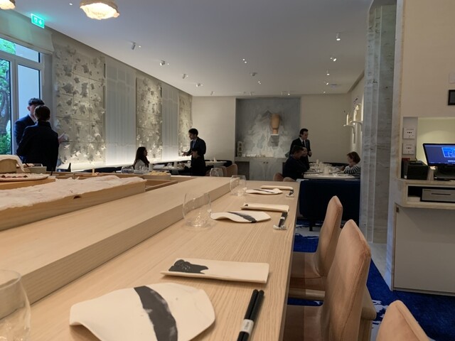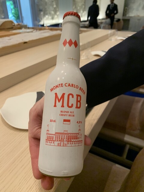 モンテカルロの高級ホテル内寿司店、多数の星持つアレノグループ傘下ゆえか、昨年岡崎シェフがパリ店から移籍後、いきなり2つ星です。パリ店では2番手が担当でしたが、当店はカウンター岡崎氏、早い時間帯だったので、色々話しが聞けました〜、つまみ付OMAKASE、物量多く、昼が重かったせいもあり、デザートはギブアップ。ワインにも合うつまみとのことですが、ワインはもううんざりで今回はビールだけ。フランス産ササニシキ、食感ふんわり。味付けはガリ含め現地人好みに合わせピリ辛方向です。海っぺり道路側は週末のF1モナコGPの準備中です。