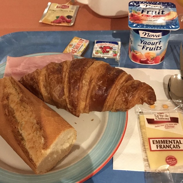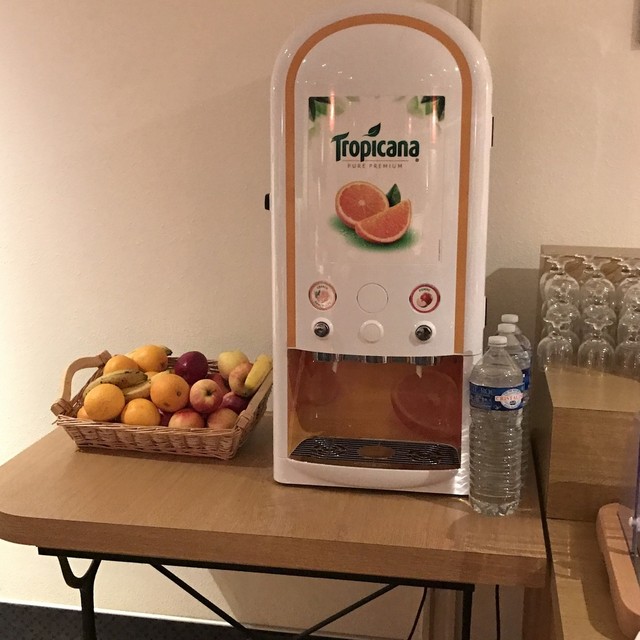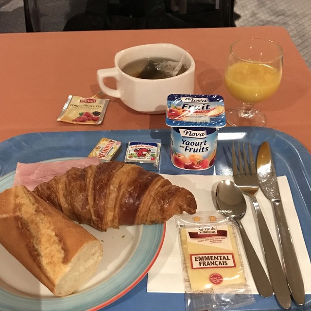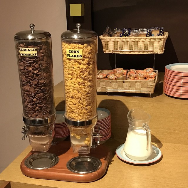 朝食はチーズ2種、ヨーグルト、りんご、バナナ、オレンジ、クロワッサン、バゲット、ジャム3種、ハム、フレーク、トロピカーナのオレンジとりんごのサーバー、ホットドリンクマシーン