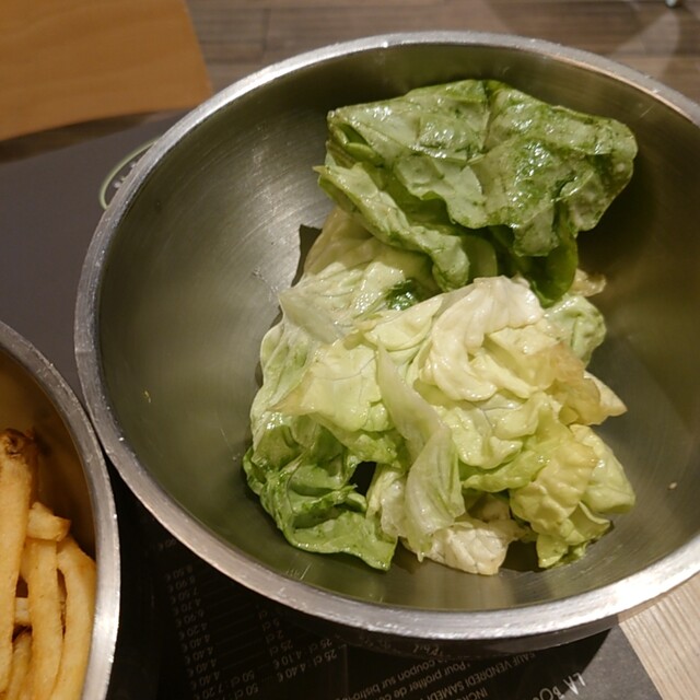 やはり山盛りのポテトと山盛りのレタス、パンが添えられます。