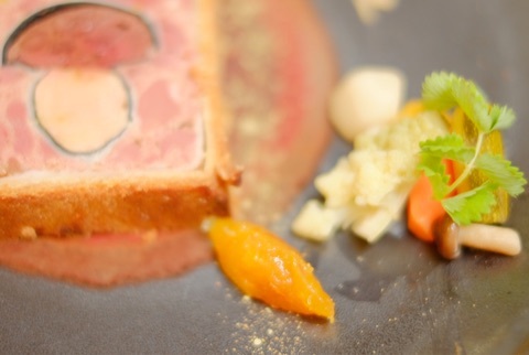 パテ アン クルート (鳩、リードヴォー、フォアグラ) 金柑のチャツネ 自家製ピクルスと焼き茄子のプルプ