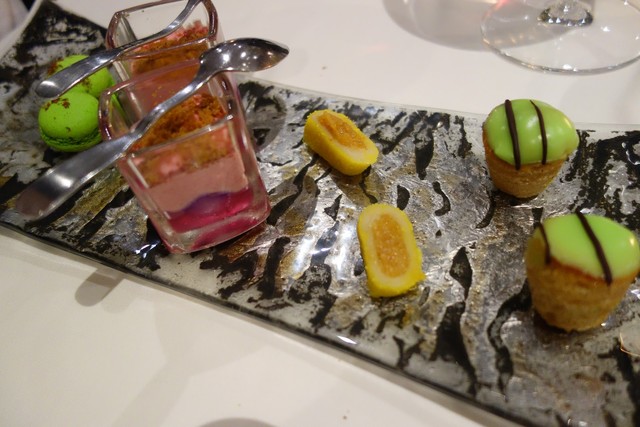 小菓子は和のテイストが感じられるマカロンにラズベリーとライチのムース、カルダモンのゼリーにバナナのタルトです。最後の最後まで細やかな仕事ぶりでした。