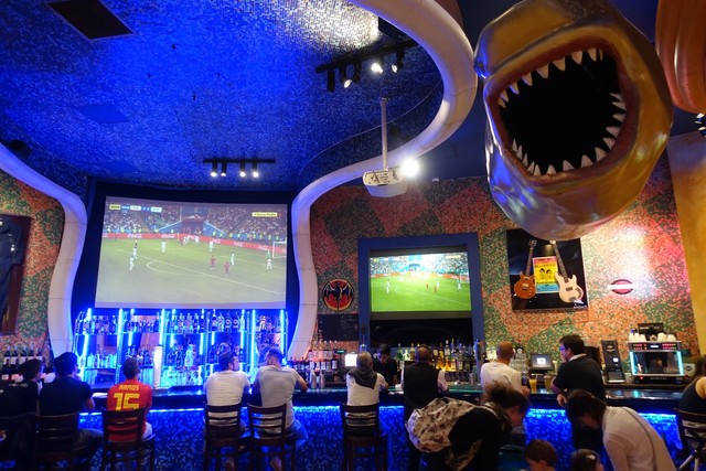 バーカウンターではワールドカップ放映中。酒を1杯づつ飲んで、ちょっとつまんで3,000円ちょい。若干割高ではありますがテーマパーク近辺で食べる食事と考えればこんなものでしょう。1皿ごとのボリュームが大きいので、大勢で来てシェアするぐらいが丁度良いと思います。