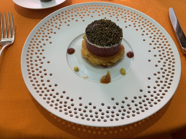 ザールブリュッケンから快速で1駅、独仏国境ザール川っぷち、300年前の僧院をレストランに仕立てています。陶器の街でミシュラン星付とはいえ、観光客がそうそう来るエリアではないので、メニューは独仏語のみ、国境はモバイル不安定で、Map、翻訳共々往生しましたが、附属ホテルの弱いWi-Fiでなんとか。セットメニューは飽きたところで、幸いアラカルトありで、好物ビーフタルタル、帆立カルパッチョ、平目ソテー。ビーフタルタルは豪華キャビア仕様、ホタテは微塵切酢漬けりんごにスパイシーソース、平目は付け合わせ2点、お味はかなりいいです。日曜ランチ、地元民でほぼ満席です。お味は2つ星クラスなのに、サービスはいまいち。