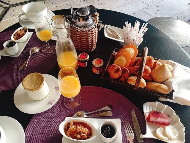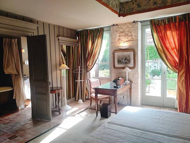 宿泊したのはChambre 1(1号室)で、2連泊しました。部屋は2階にありインテリア、リネンもシャトー風です。広いテラスがあり、中庭のプールを見渡すことができ、明るい雰囲気です。