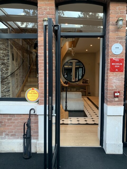 グルノーブル山中の高級ホテル附属2つ星グリーンスターレストラン、アヌシーから電車・バス乗り継ぎ到着、昼夜共通メニュー日曜12時15分スタート、肉抜きコースにワインペアリング。意外にスパイシー・スモーキ...