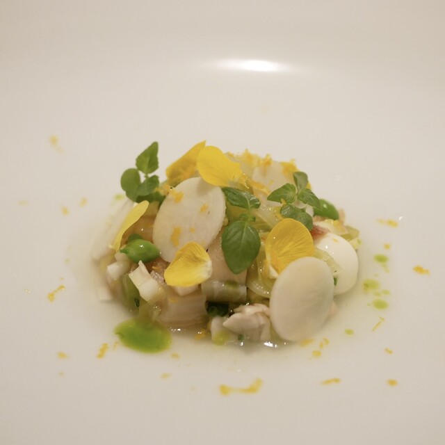 蕪をバターとハマグリの出汁の煮込み グリーンアスパラと春菊のラビオリ
