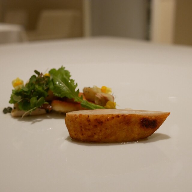 トウモロコシ コンテ 18カ月ソース トリュフを挟んだ帆立 蜂蜜 サラダ