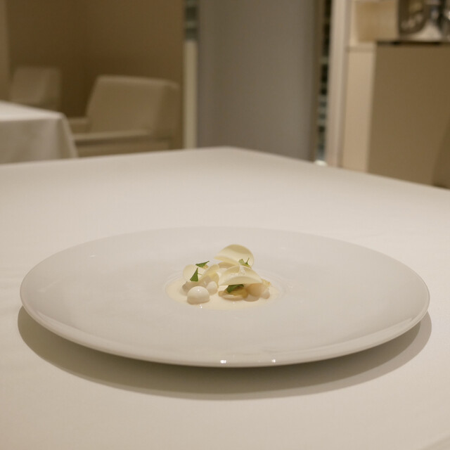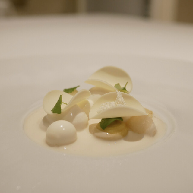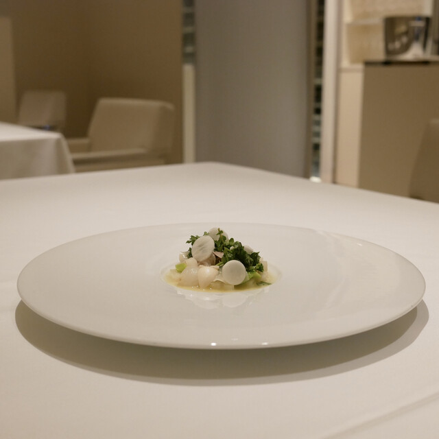 鶏のブイヨンと海藻と浅利の冷たいソース クレームドユズ 白菜と白ミル貝 ポワロー