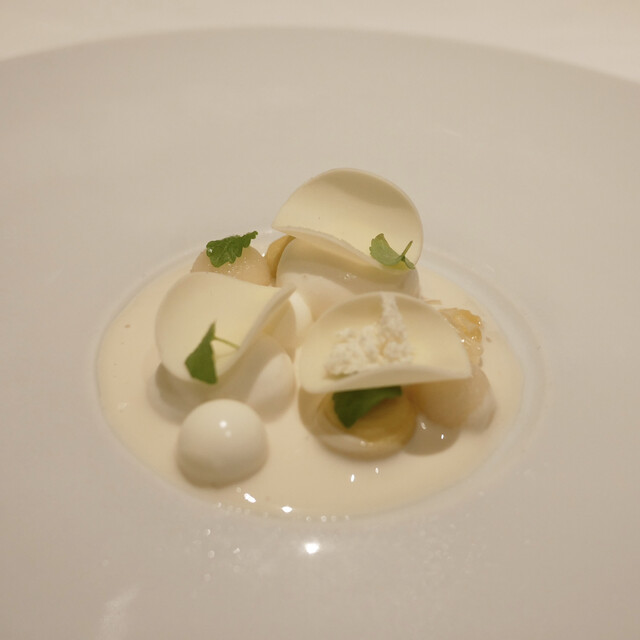 花蜜とカモミールソース フレッシュのライチと水晶文旦と薩摩芋のクリーム ベルガモットのエスプーマ オパリス(ホワイトチョコ)ジュドフルール