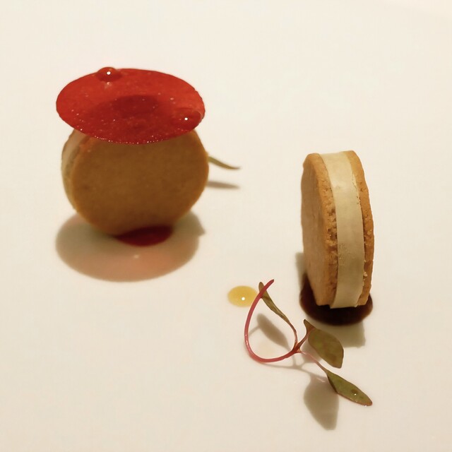 始まりの一皿。フォアグラのアイスをスペイン産のマルコナアーモンドで作ったクッキーの間に挟んだもの。手前側がラムレー...