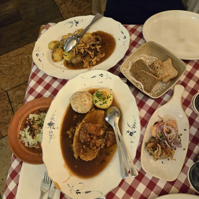 じゃがいもニョッキ(Knödel)とパン入り団子(Semmelknödel)も添えてあります。