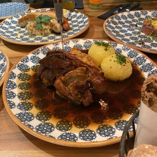 ババリアですものその2 シュバイネハクセ(豚の骨付きすね肉丸焼き。滋養とはこういうもの、という味わい。付け合わせはクヌーデル? ポテトサラダ? そりゃ前者に決まってるンである!