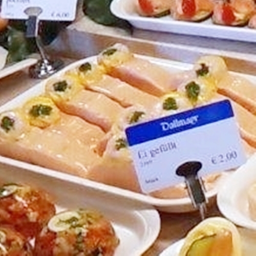 日本のダルマイヤーのイメージが強かったので、てっきりハム専門店かと思っていたのですが、店内を眺めてみるとショーケースの中には煌びやかなお惣菜の数々(笑)ドイツの総菜屋さん…というか飲食店で、こういう華やかで凝った感じの品を見た事なかったのでびっくりしました。他国と比べても惣菜が充実している日本のデパ地下の総菜店でも、ここまで凝った品を置いてるお店は中々無いのでは。
