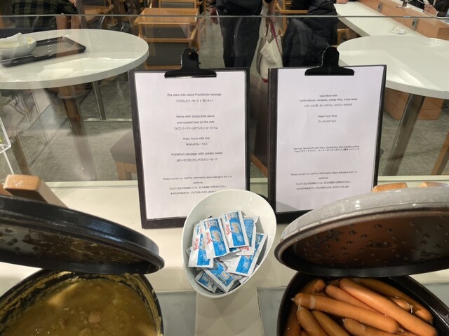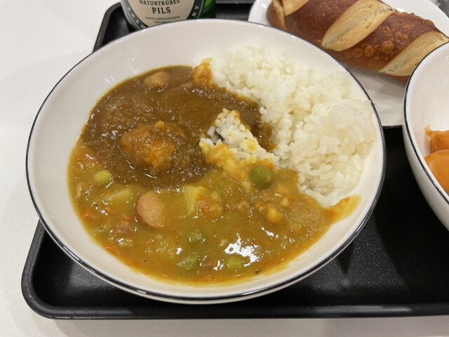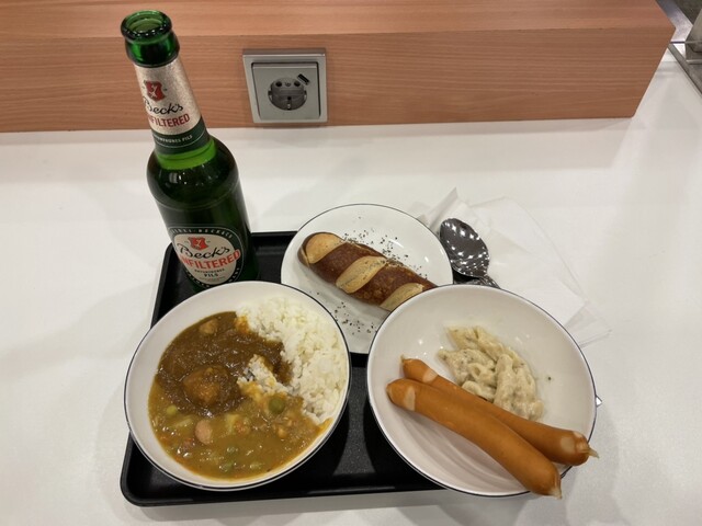 カレーと豆スープあいがけ、ソーセージとペンネ、プレッツェル、ドイツビール