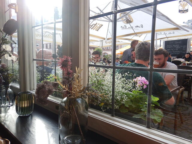 屋外のテラス席にするか屋内にするか聞かれました。屋外は小団体さんたちで大賑わい。喫煙も自由。私たちは屋内の窓際の席に。冷房はありませんが、流れてくる空気は心地よい。