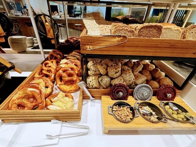 ドイツらしいパンにハムやソーセージ、ビール好きには格別のラウンジ。