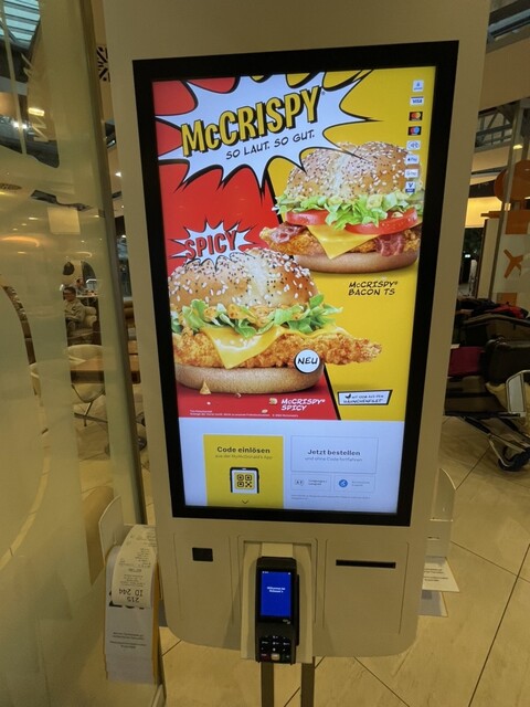 フランクフルト国際空港の第二ターミナルにあるマクドナルド。チェックインカウンターのあるエリアからエスカレータで上がった場所にある。マクドナルドでは注文がカウンターではなく、タブレットのようなもので注文...