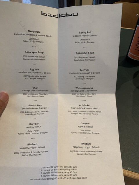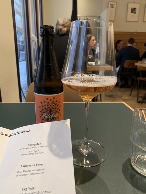 市内中心部ショッピングエリアの星付ベジ系ビストロ。割と強気のお値段、2回転制、20時15分スタート、満席です。お高いワインは回避、マインツの地ビールにします。選べるコースも最小の4コース、Spring...