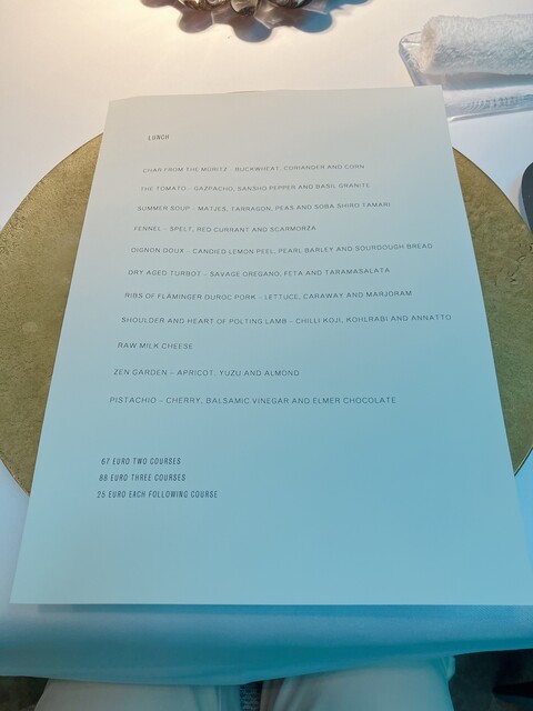 コースはプリフィクス。88ユーロの3品のコースにした。これに炭酸水の大きなボトル、コーヒー、10%のチップで合計113.5ユーロ
