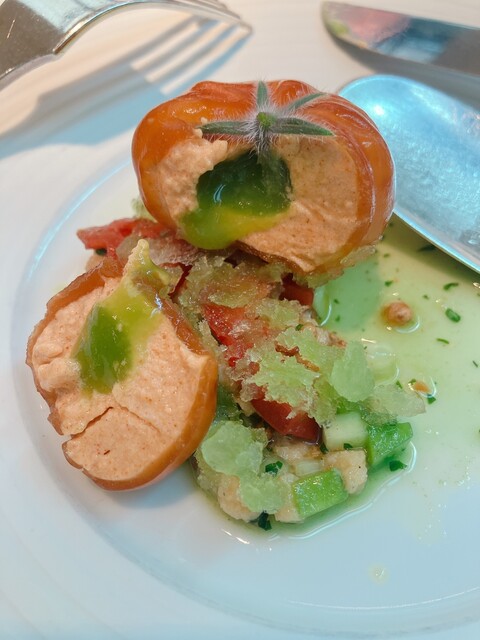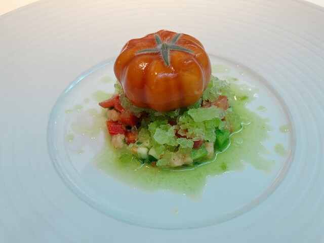 トマトのゼリーの中にトマトムース、その中に、きゅうりのグリーガスパチョのソース