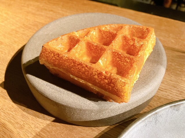 ワッフルの中にもラクレットチーズ。なので塩気ある味わい。甘みはゼロ。