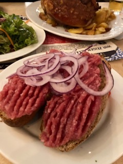 豚ミンチ・・・豚の生ミンチwhithバケット。ドイツは無菌豚なのでOKだそうで、現地の方が是非ととにかく進めて頂いた料理です。好みはあるとおもいますが、普通かな〇味が決まらない感じで本当に生肉をくってるだけ感。