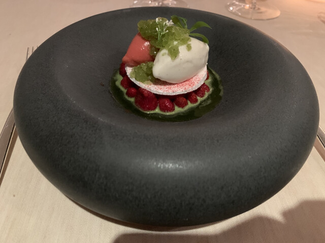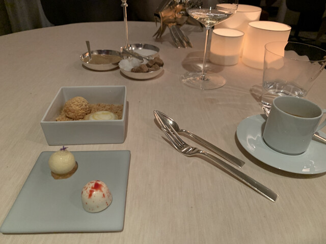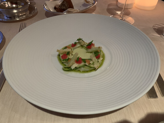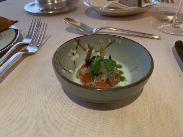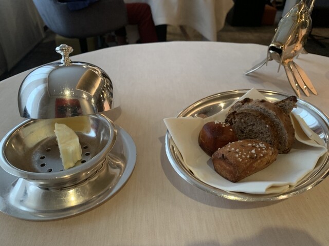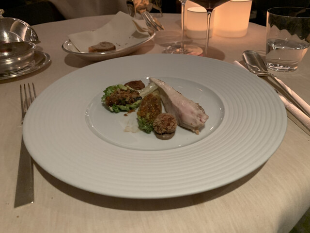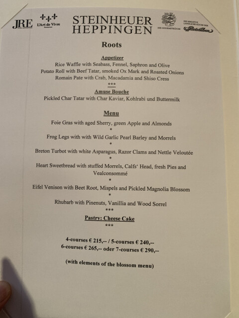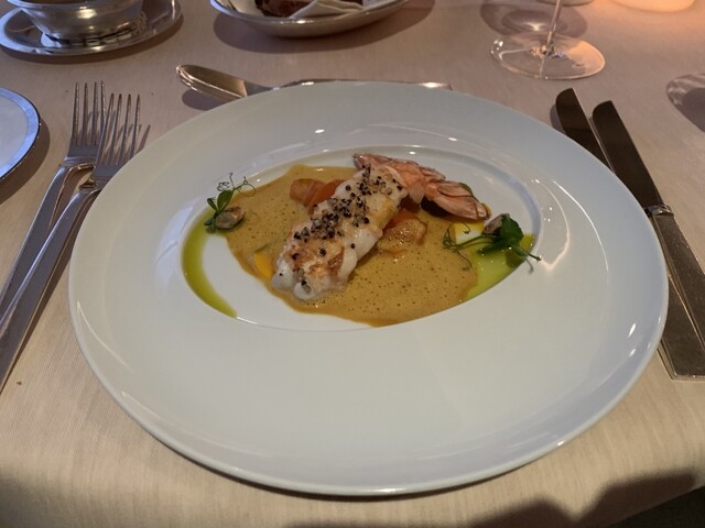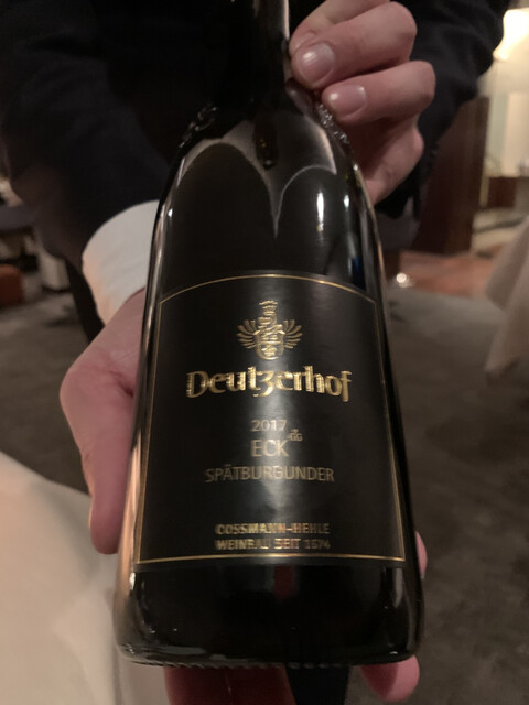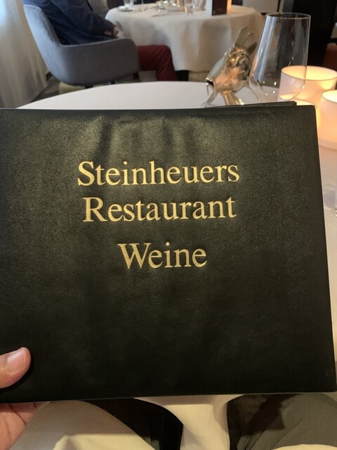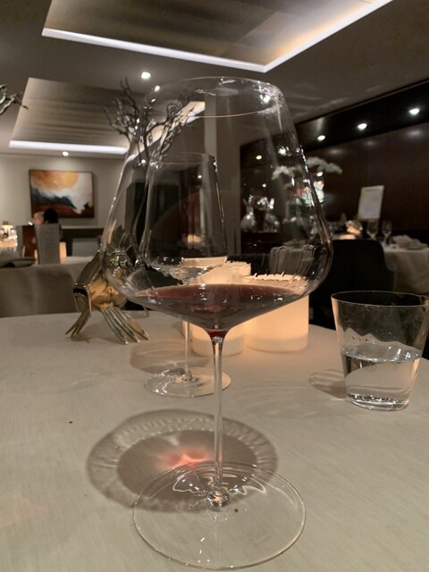 交通事情悪く、30分遅れで20時到着、ホテル階下の2つ星レストラン。地元密着ビストロも壁を隔てて同建物内にあり、そちらは賑やかに盛り上がっています。テイスト違う2種メニューから選べる4〜7コース、5コースにします。フルボトルは自重して、ラインガウのハーフサイズ。雰囲気・サービスは最高、有塩バターはびっくりする塩辛さ、お料理味付け濃いめですが、まずまず(//∇//)