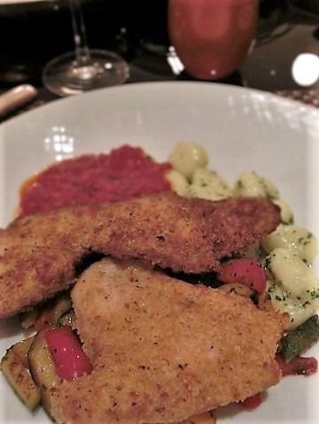 七面鳥のピカタ ピーマンとズッキーニの温野菜の上に