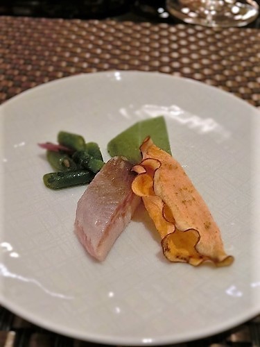 で、本日のディナーなんですが、まずはアミューズで、ウナギとリンゴのチップス