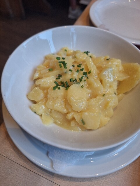 シュバイネシャウフェレは、骨付きの豚肩肉をじっくり焼いた、フランケン地方の伝統料理です。付け合わせに”ダンプリング”とメニューにありましたが、これはジャガイモをベースにした野球ボールくらいの大きさの、ボヨボヨっとした塊で、私はあまり好みではないので、今回はポテトサラダに変更してもらいました。スグリジュースは予想通りの味。アスパラガスのスープはクリーミーでおいしい!そして、メインのポークショルダー(注文するときは、”pork shoulder”でわかってもらえます)。大きい!!!何グラムくらいなのか見当もつかないですが、余裕で二人分はあると思います。ポテトサラダも、日本のポテサラとは違って、ポテトはスライスで味は酢がベース。そして、サラダも量が多い!