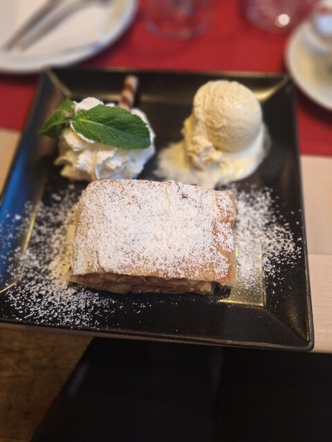 を追加で注文しました。アップルシュトゥルーデルはアップルパイ似ているのかと思っていたのですが、、アップルが少ない気がしました。こちらお店の特徴なのか、どこで食べてもそんな感じなのかは、判断つかず。アイスクリームと生クリームは普通においしく、コーヒーも普通の味でした。