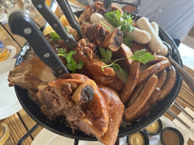 ビール、ソーセージなどの豪快な肉類乗っけ盛り、スイーツというドイツに来るといつもの組合せ。