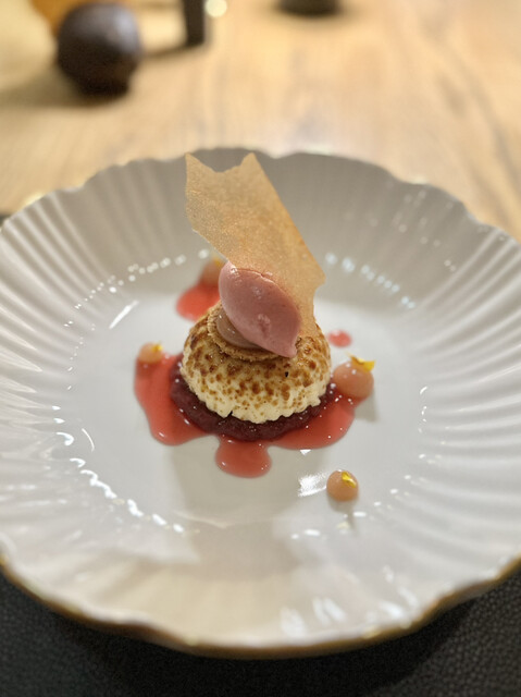 おそらく①~⑤までパンを除いた小さな料理がアミューズという感じなんでしょう。決して珍しい素材があるわけでも無いんですが、しっかりと作りこまれたテクニカルな料理。まずは満足ラインを軽く超えてきました。サーモンに美しく飾られた胡瓜。もともとサーモンにキュウリは相性良いですから、緑色のキュウリソースまでもしっかり添えられています。そして豚ホホ肉パンケーキ。とても濃厚で結構ズッシリと胃に溜まりますよ。さらにガチョウピロシキ フォアグラレバームース ガチョウのポテトラビオリの小さな3品はいずれもガチョウを使っているものの、これもまだメインではありません。そして次のガチョウパセリクリーム焼きが本当のメイン。メインの直前に肉料理が2回も出てきましたが、こういう料理が間に入ってくるのはヨーロッパらしい。日本ではまず出てこない、嬉しい驚きですね。そしてデザートはおばあちゃんのチーズケーキと言いますが、全然チーズケーキっぽくない。チーズムースの周りにピーチが散りばめられています。これも美味しいですね。でもデザートは1品だけかぁ。欲を言えばもう一品食べたかったですね。これだけ食べてこみこみ30000円以下ですから安いですね。あくまでデンマークとの比較ですけどね。日本だったら安いとは思わなかったでしょう。正直、忘れられないレストランというほどではないですけど、十分満足できるお店でした。
