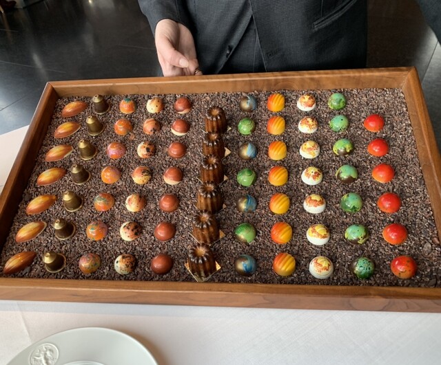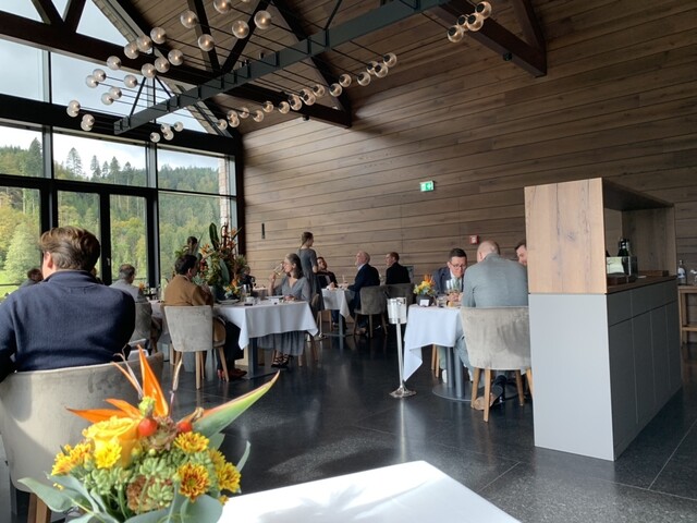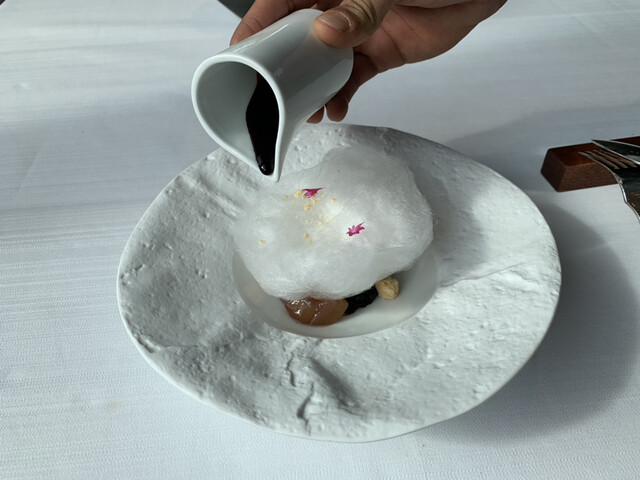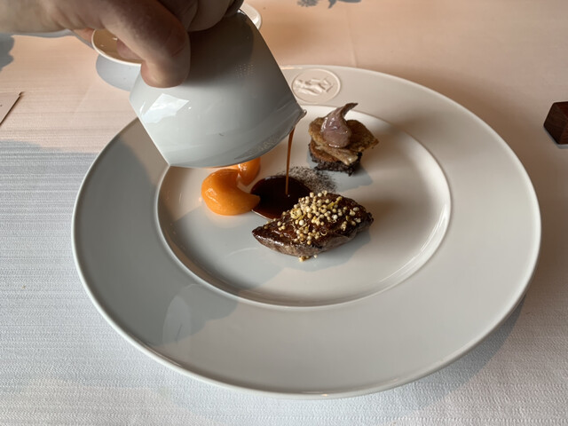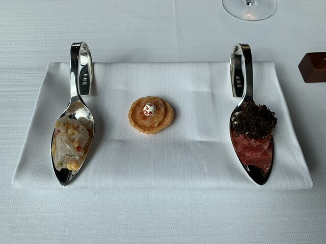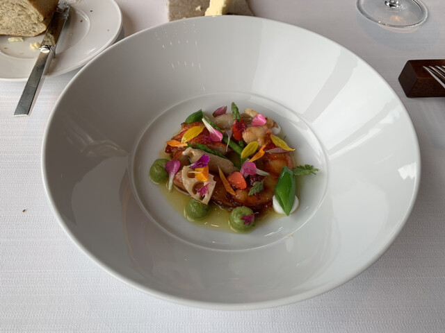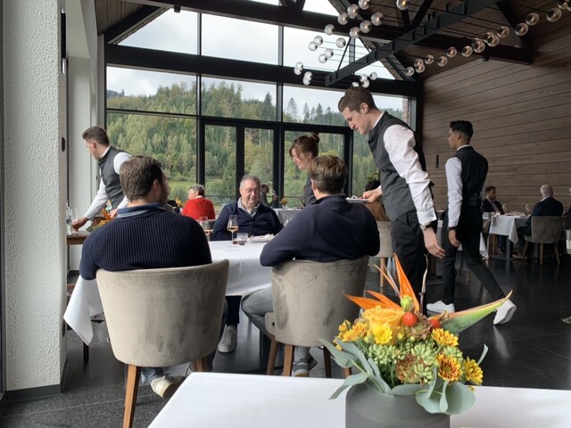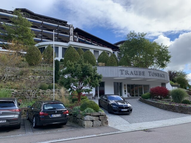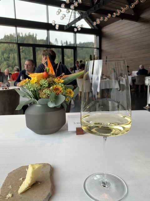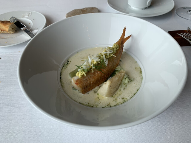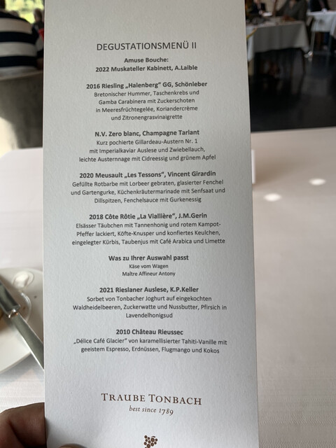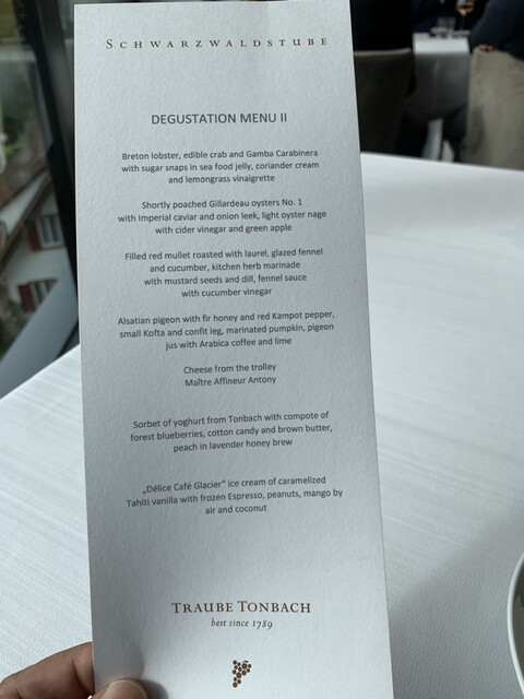 リゾートエリアの3つ星、2020年1月レストランから出火、建造200年オーバーのホテル共々全焼してしまい、2022年リオープン、今のシェフは3代目、初代はアランシャペルに師事、開店していきなり2つ星、すぐに3つ星になったレジェンドのようです。昼夜共通メニュー、魚介中心のデュギタシオンメニュー&ワインペアリング。お料理、ワイン共々上質な酸味が効いてまずまずです。なお当方ネーム違ってます、日本名だけど。行き帰り共に宿から爽やかな黒い森遊歩道片道5km強ずつ歩いて来ました。