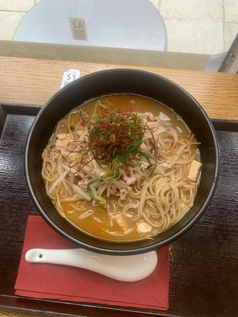 具材ももやし豚肉のこま切れとしっとりとした野菜が入り、葱や焦がしニンニクが添えられます。