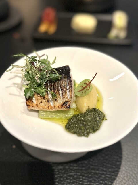 ⑫サバの炭火焼き、ポレンタ、若ネギ、チミチュリソース(アルゼンチン料理のソース)