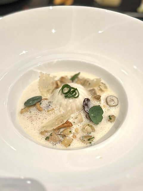 ⑪新潟コシヒカリのリゾット、シャンピオンホヤ(ブランドマッシュルームの名前)、ヴァルトピーゼ(キノコの種類)、パルメザンチーズ