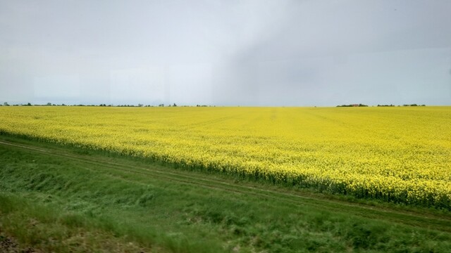 草原と発電用風車、太陽光パネル、そして黄色い菜の花畑が目につく車窓でした。
