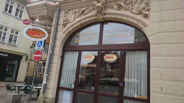 Ristorante Perli's Pasta Mia 窓に日本語でイタリア料理店と書いている