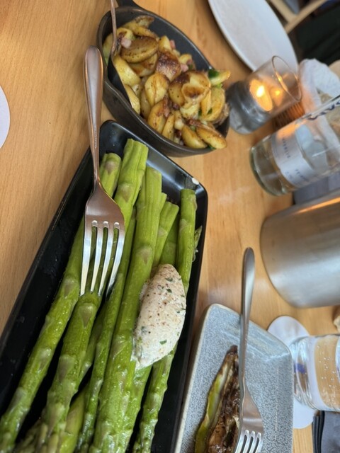 夜の居酒屋タイムに訪問しました。テラス席もありますが、今回は店内で。海鮮系のメニューがウリですが、アスパラや野菜のメニューも美味しいです。日本人には少し塩気が多いですかね。美味しいワインも頂けました。...